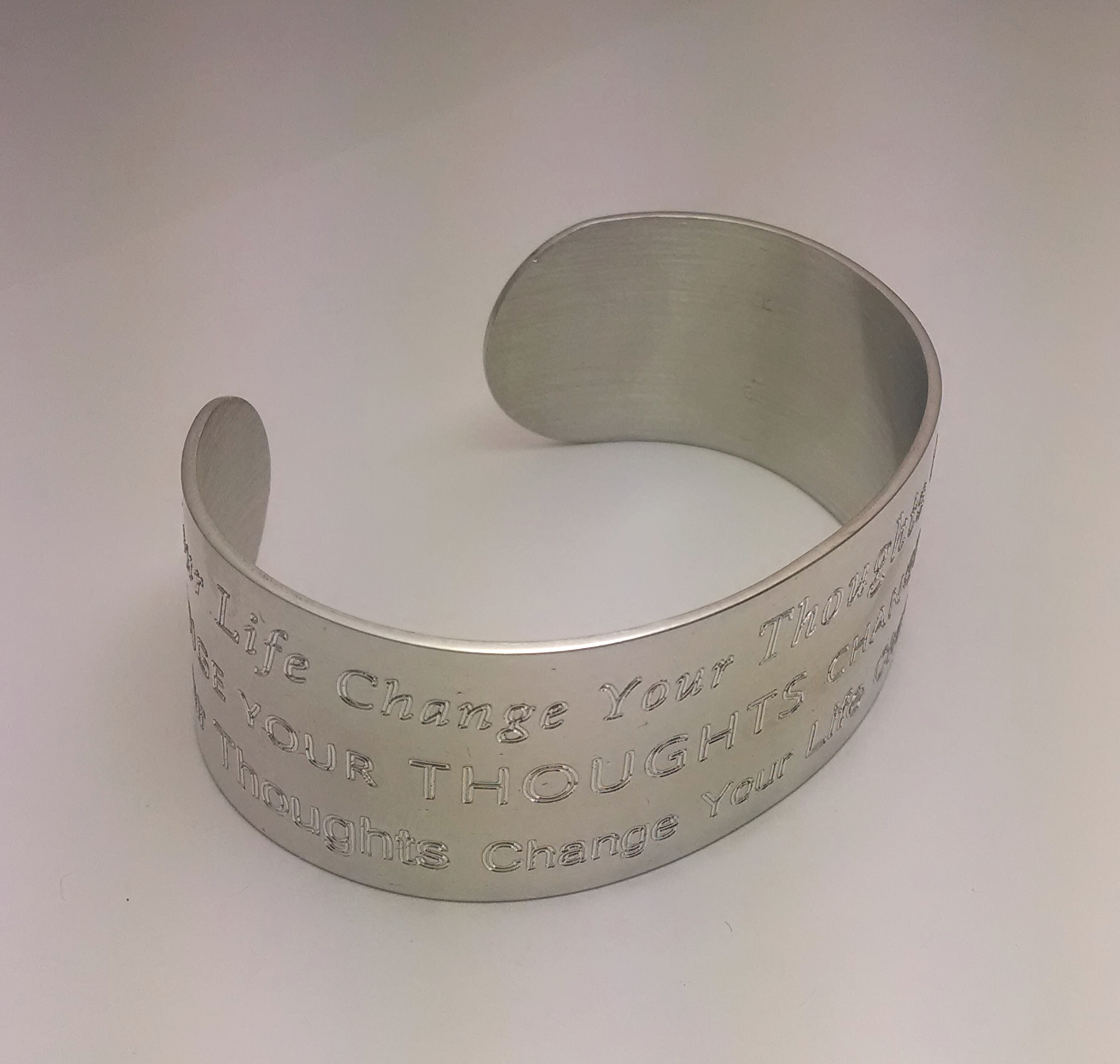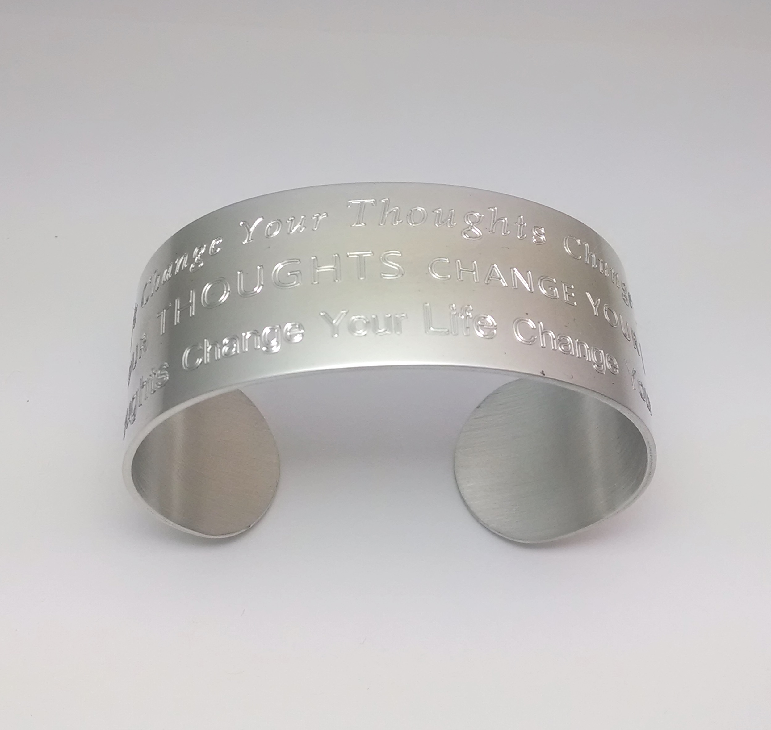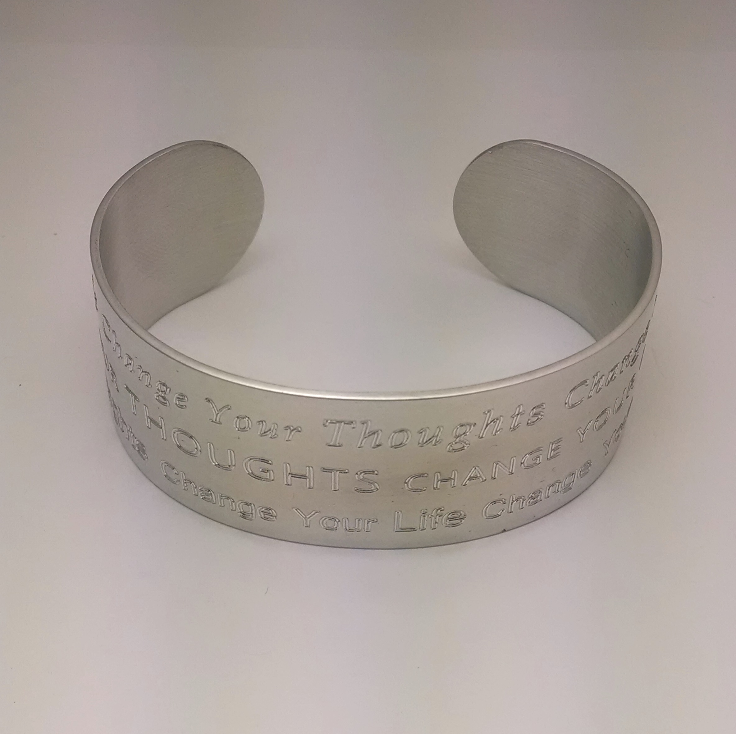From the Sage Wise Words Collection comes a stunning engraved pewter cuff with the wise words, "Change Your Thoughts Change Your Life" repeated over and over. Because thoughts are things, choose them wisely.