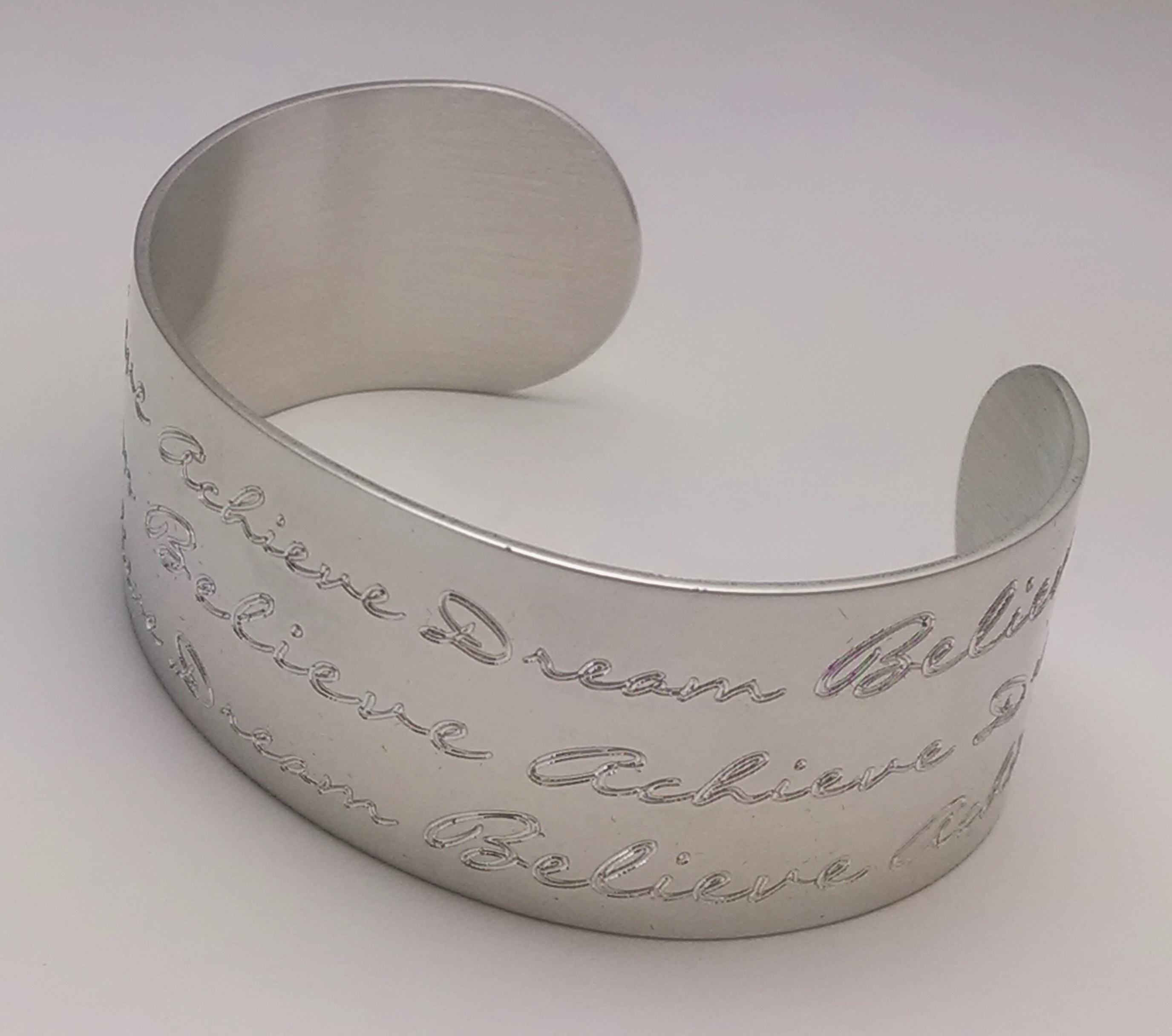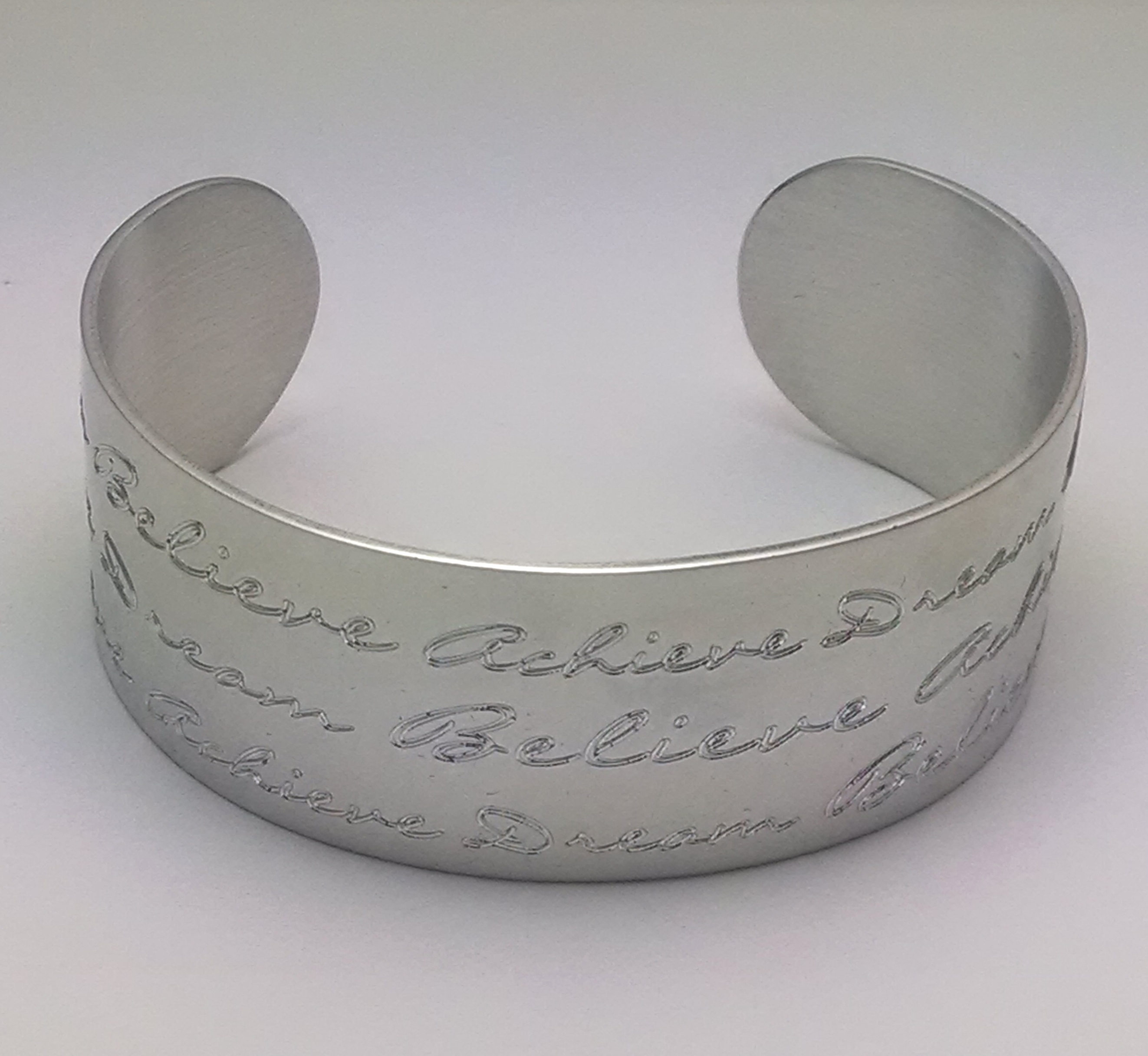 From the Sage Wise Words Collection comes a stunning engraved pewter cuff with the wise words, Dream Believe Achieve, repeated over and over. Because whatever the mind can conceive, and believe, it can achieve.